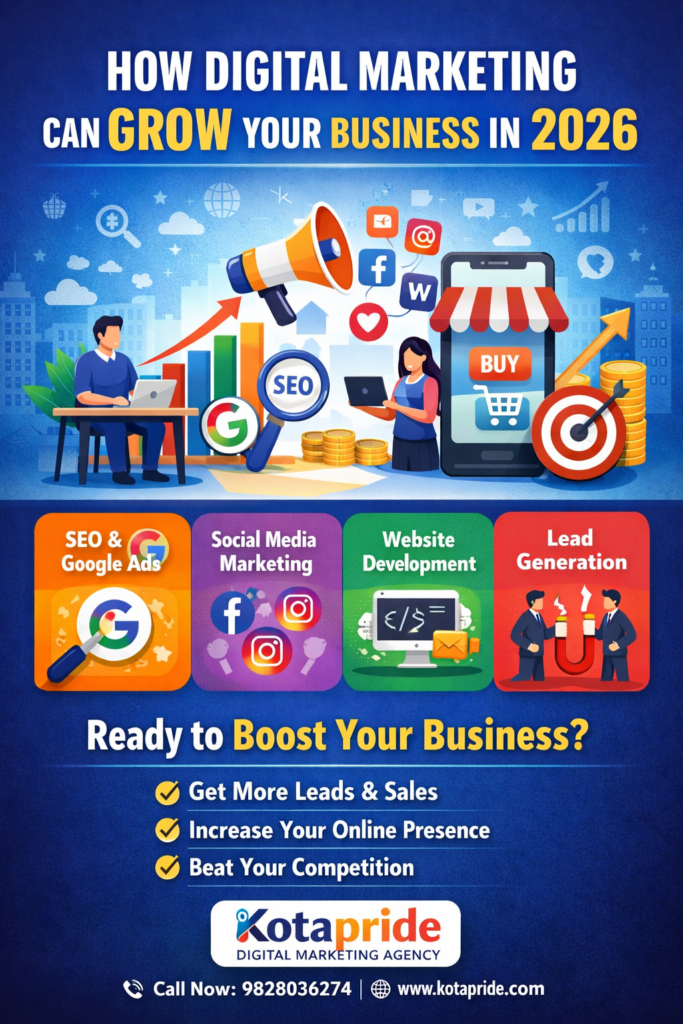 Kotapride Digital Marketing Agency businesses ko online grow karne ke liye complete digital solutions provide karti hai, jisse aap apne competitors se aage badh sakte hain.