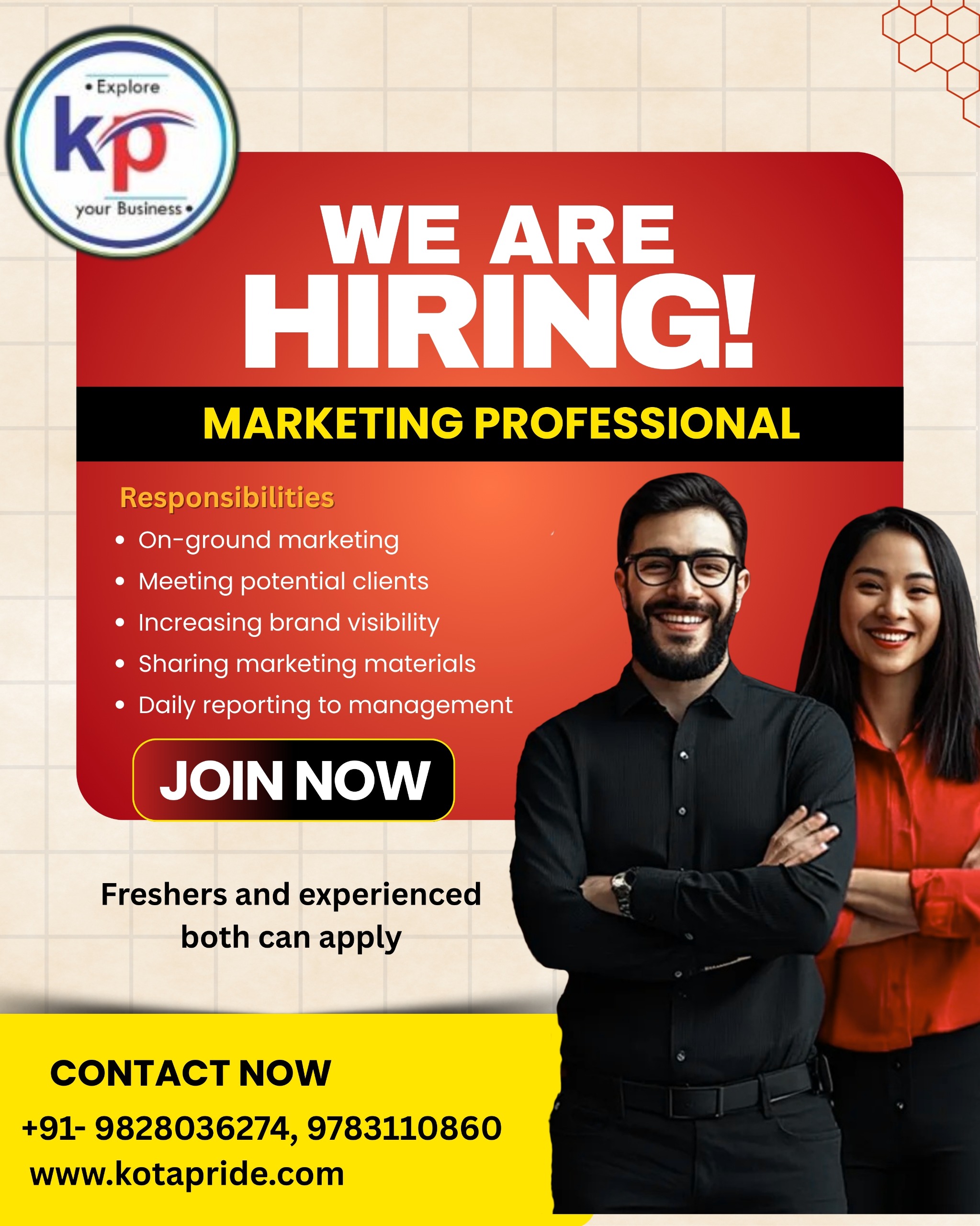 KotaPride is hiring energetic Field Executives to visit local shops, medical stores, clinics, and doctors in Kota and promote our Digital Marketing, Website Development, and Branding Services.